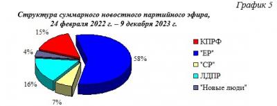 Всего в период с 24 февраля 2022 г. по 9 декабря 2023 г. суммарный политический эфир составил 59 часов 33 минуты эфирного времени. При этом 58% эфира получила «Единая Россия», 16% ЛДПР, 15% КПРФ, 7% «Справедливая Россия» и 4% «Новые люди». Компартия заняла третье по освещению место в телеэфире.