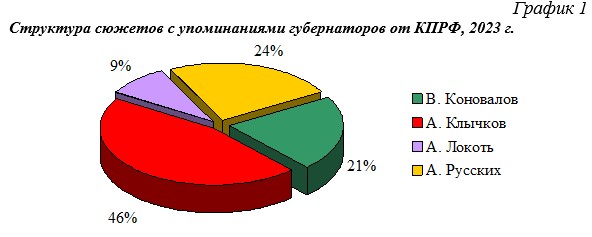 Таким образом, наибольшее число сообщений в 2023 году было посвящено А. Клычкову (102 сюжета или 46%). Второе по освещению место занял А. Русских (54 сюжета или 24%). В. Коновалов упоминался в 48 сообщениях (21%), А. Локоть – в 20 (9%) (Гр. 1).