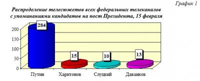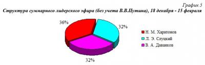 Как видим (гр.2), если анализировать информационную ситуацию с начала заявительно-регистрационной фазы кампании с 18 декабря по 15 февраля - 84% всех телесюжетов посвящены В.В.Путину, 6% - Л.Э.Слуцкому, по 5% - Н.М.Харитонову и В.А.Даванкову.