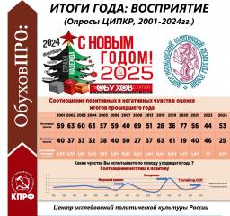 Вот уже более 20 лет, с 2001 года, традиционно в исследованиях Центра исследований политической культуры России (ЦИПКР) в канун Нового года изучается морально-психологическое состояние российского общества. Респондентам в декабре 2024 г. задали традиционный вопрос о чувствах в отношении прошедшего 2024 года.