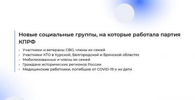 Всего КПРФ было предложено 113 инициатив, ориентированных на разные социальные группы, 23 из них касались новообразованных сообществ. В рейтинге активности по работе с традиционными группами лидеры у КПРФ: Г.Зюганов, Н.Коломейцев, Н.Останина, по новым группам - К. Тайсаев, А. Корниенко и М. Матвеев.
