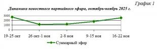В течение октября – ноября 2025 г. общий объём суммарного новостного партийного телеэфира изменялся следующим образом (Гр.1):