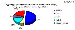 Всего в период с 24 февраля 2022 г. по 22 ноября 2025 г. суммарный политический эфир составил 130 часов 7 минут эфирного времени. При этом 51% эфира получила «Единая Россия», 20% КПРФ, 15% ЛДПР, 8% «Новые люди» и 6% «Справедливая Россия». Компартия заняла второе по освещению место в телеэфире.