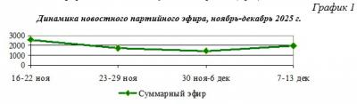 В течение ноября – декабря 2025 г. общий объём суммарного новостного партийного телеэфира изменялся следующим образом (Гр.1):