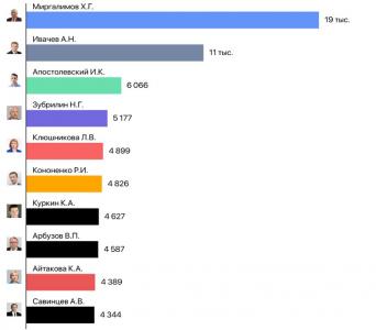 Как видим, впереди лидер фракции КПРФ в Государственном Совете Республики Татарстан, первый секретарь Татарстанского рескома Х.Г.Миргалимов (1), затем вице-спикер Свердловского ЗАКСа, руководитель областной парторганизации А.Н.Ивачев (2), лидер фракции КПРФ в Заксобрании Ленобласти И.К.Апостолевский (3), руководитель фракции КПРФ в Мосгордуме Н.Г.Зубрилин (4), депутат Алтайского краевого Законодательного Собрания Л.В.Клюшникова (5), затем депутат Санкт-Петербургского ЗАКСа, руководитель питерских коммунистов Р.И.Кононенко (6), руководитель фракции КПРФ в Заксобрании Челябинской области К.А.Куркин (7), депутат Московской городской Думы В.П.Арбузов (8), заместитель председателя Законодательного Собрания Пермского края К.А. Айтакова (9), руководитель фракции КПРФ в Думе ХМАО А.В.Савинцев (10).
