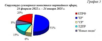 Всего в период с 24 февраля 2022 г. по 24 января 2025 г. суммарный политический эфир составил 135 часов 7 минут эфирного времени. При этом 51% эфира получила «Единая Россия», 20% КПРФ, 15% ЛДПР, 8% «Новые люди» и 6% «Справедливая Россия». Компартия заняла второе по освещению место в телеэфире.
