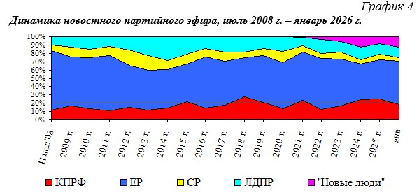 В течение июля 2008 г. – января 2026 г. структура новостного партийного телеэфира менялась следующим образом (Гр.4):