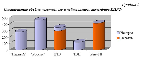 Таким образом, 44% суммарного эфира КПРФ носило негативный характер. Наибольший объём негатива вышел на канале Рен (100% всего коммунистического эфира на канале) и НТВ (86% эфира телеканала) (График 5).