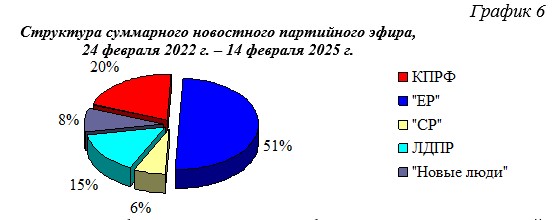 Всего в период с 24 февраля 2022 г. по 14 февраля 2025 г. суммарный политический эфир составил 137 часов 39 минут эфирного времени. При этом 51% эфира получила «Единая Россия», 20% КПРФ, 15% ЛДПР, 8% «Новые люди» и 6% «Справедливая Россия». Компартия заняла второе по освещению место в телеэфире.