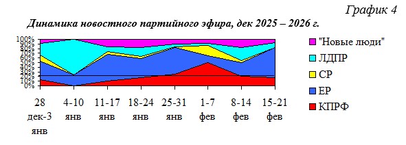 В течение декабря 2025 г. – февраля 2026 г. структура новостного партийного телеэфира менялась следующим образом (Гр.4):