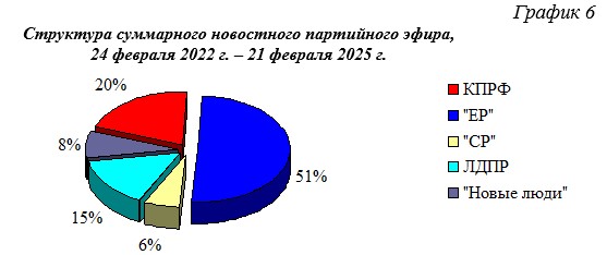 Всего в период с 24 февраля 2022 г. по 21 февраля 2025 г. суммарный политический эфир составил 138 часов 39 минут эфирного времени. При этом 51% эфира получила «Единая Россия», 20% КПРФ, 15% ЛДПР, 8% «Новые люди» и 6% «Справедливая Россия». Компартия заняла второе по освещению место в телеэфире.