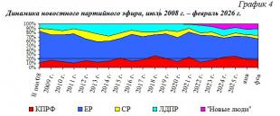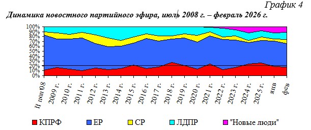В течение июля 2008 г. – февраля 2026 г. структура новостного партийного телеэфира менялась следующим образом (Гр.4):