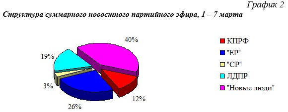 За период с 1 по 7 марта в новостных выпусках на федеральных телеканалах пяти парламентским партиям было предоставлено 35 минут 54 секунды эфирного времени, что в два раза меньше, чем на предыдущей неделе.