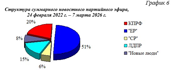 Всего в период с 24 февраля 2022 г. по 7 марта 2026 г. суммарный политический эфир составил 140 часов 25 минут эфирного времени. При этом 51% эфира получила «Единая Россия», 20% КПРФ, 15% ЛДПР, 8% «Новые люди» и 6% «Справедливая Россия». Компартия заняла второе по освещению место в телеэфире.