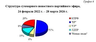Всего в период с 24 февраля 2022 г. по 28 марта 2026 г. суммарный политический эфир составил 141 час 41 минуту эфирного времени. При этом 51% эфира получила «Единая Россия», 20% КПРФ, 15% ЛДПР, 8% «Новые люди» и 6% «Справедливая Россия». Компартия заняла второе по освещению место в телеэфире.