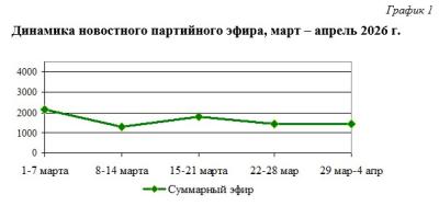 В течение марта – апреля 2026 г. общий объём суммарного новостного партийного телеэфира изменялся следующим образом (Гр.1):