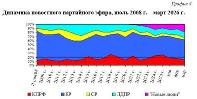 Динамика новостного партийного эфира, июль 2008 г. – март 2026 г.