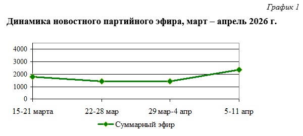 В течение марта – апреля 2026 г. общий объём суммарного новостного партийного телеэфира изменялся следующим образом (Гр.1):