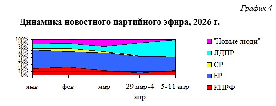 В течение 2026 г. структура новостного партийного телеэфира менялась следующим образом (Гр.4):