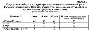 Таким образом, партия власти, как оказалось, возможно, неожиданно для себя самой получила некоторую возможность, паразитируя на ценностях левой политической субкультуры, играть на левом поле. Скорее всего, эффект, достигнутый властью, скоротечен и преходящ, он получен за счет мобилизации мощного административно-медийного ресурса, но этот симптом не может не вызывать известной тревоги. Правда, это относится к разряду непосредственных результатов, полученных более от декларирования идеи народного фронта, к тому же имеющей мощное медийное сопровождение, чем от ее реализации. И это же пока не сказалось на конфигурации электоральных намерений – готовности голосовать на думских выборах за ту или иную партию, – запас инерционности которых гораздо выше (табл. 3). Во всяком случае, на протяжении мая соотношение сил между партиями пребывало практически в неизменности и никакие фронтистские поползновения не смогли на него каким-либо образом повлиять.