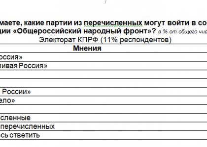Насколько можно судить, принадлежность понятия народного фронта к сфере левой политической субкультуры, с одной стороны, а также медийный натиск официальной пропаганды, поднятый информационный ажиотаж вокруг этой идеи партии власти, отчасти возымели свои последствия, дезориентировав некоторые слои коммунистического электората. Притом что последний в значительной своей мере (47%) трезво обозначил свое отношение к новой затее партии власти, определив ее истинную цену, более четверти электората коммунистов (27%) неоправданно восприняли ее всерьез. Иными словами, относительное большинство усмотрело в этом очередное предприятие партии власти, высказавшись, что именно «Единая Россия» может войти в состав новой организационной структуры. Между тем упомянутые 27% коммунистического электората оказались готовыми увидеть среди членов народного фронта и КПРФ (табл. 2).