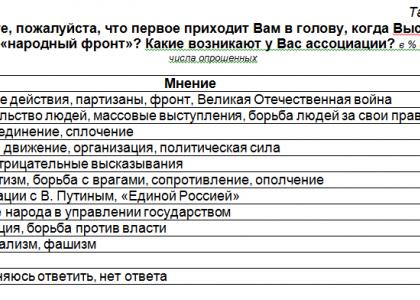 Эта же логика наблюдается в иных толкованиях народного фронта, собравших, правда, куда меньшее число сторонников. 3% опрошенных связали политическую формулу партии власти с идеями патриотизма, прямо усмотрев в этом сам «патриотизм», «защиту Отечества», «борьбу против врагов, плохой жизни», «сопротивление людей чему-то» и даже создание неких, надо думать, военизированных формирований – «добровольцев, ополченцев», «народного ополчения». Для меньшинства в 1% - это, по-видимому, призрачные и несбыточные надежды хоть на какую-то реальную демократизацию нашего общественного уклада, которая предполагала бы «участие народа во власти, в управлении государством», «мнение из народа», «власть народа, народ участвует в принятии решений», «чтобы простой народ шевелился, а не сидел по своим квартирам». Еще 1% мнений отражает самую настоящую превратность представлений о народном фронте, ошибочно сопрягая эту политическую формулу с деятельностью оппозиции. Это еще раз указывает на стойкость ассоциаций идеи фронтизма именно с левой политической субкультурой, что, однако, в данном случае означает, что инициатива партии власти оказалась в состоянии дезориентировать некоторую, пусть весьма малую, часть общественного мнения.