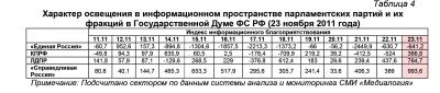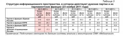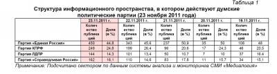 Контент-анализ публикаций СМИ с помощью системы «Медиалогия» позволил выявить следующую структуру информационного пространства, в котором действуют думские политические партии (таблица 1).