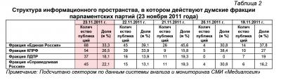 Контент-анализ публикаций СМИ позволил выявить также структуру информационного пространства, в котором действуют думские фракции парламентских партий (таблица 2).