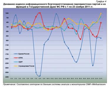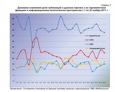 23 ноября 2011 г. в информационном пространстве отмечалось 450 упоминаний партии «Единая Россия» или 44,8% от общего числа высказываний, озвученных в адрес парламентских партий. В 249 материалах (24,8%) фигурировала КПРФ, в 162 (16,1%) – «Справедливая Россия», а в 144 (14,3%) – ЛДПР.