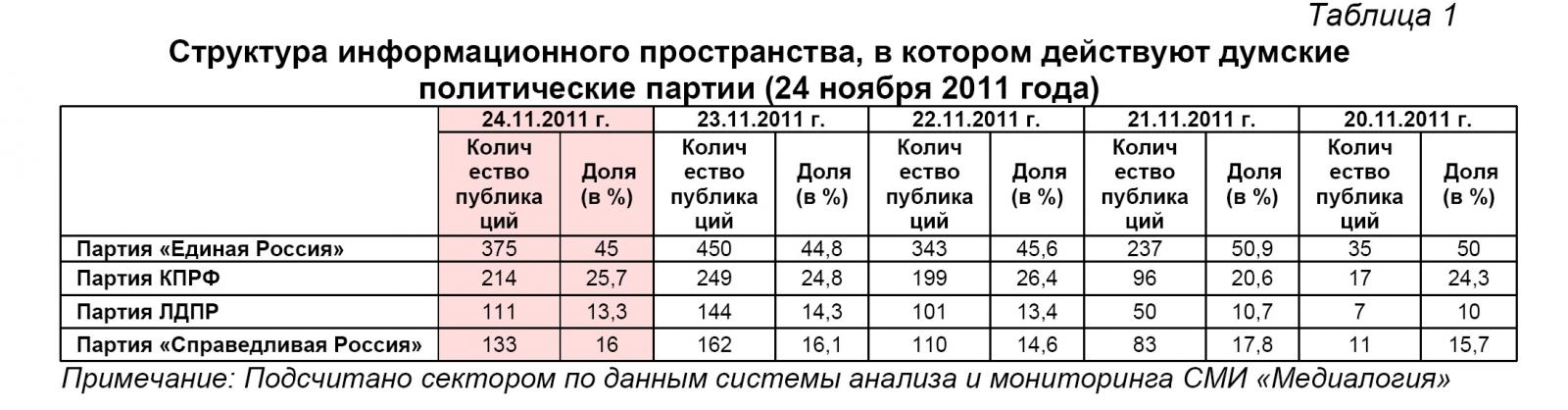 Контент-анализ публикаций СМИ с помощью системы «Медиалогия» позволил выявить следующую структуру информационного пространства, в котором действуют думские политические партии (таблица 1).