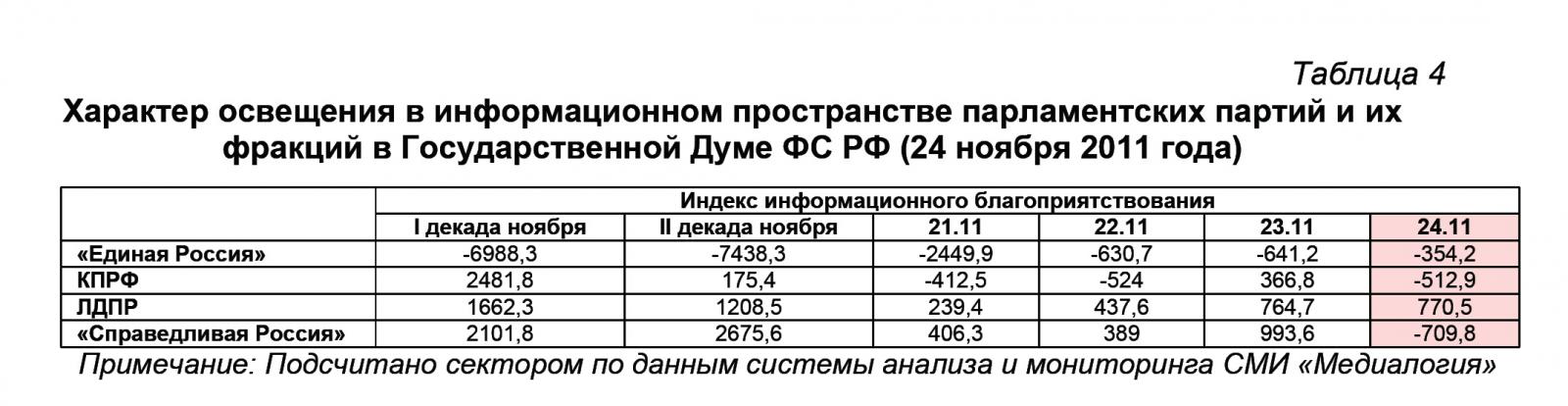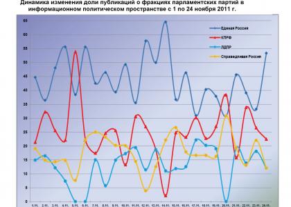 24 ноября 2011 г. в информационном пространстве отмечалось 375 упоминаний партии «Единая Россия» или 45% от общего числа высказываний, озвученных в адрес парламентских партий. В 214 материалах (25,7%) фигурировала КПРФ, в 133 (16%) – «Справедливая Россия», а в 111 (13,3%) – ЛДПР.