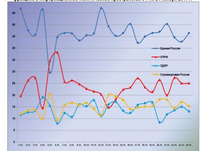 Динамический ряд, отражающий порядок наполнения медиа-потока публикациями о деятельности парламентских партий за период с 1 по 24 ноября 2011 г. (график 1), позволяет заключить, что 24 ноября показатель коммунистов был близок к максимальному, единороссов – к минимальному, а эсеров и либерал-демократов – к среднему за анализируемый период значению.