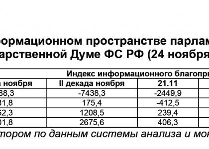 «Тематический аспект» присутствия парламентских партий в информационном пространстве 24 ноября по-прежнему, преимущественно, сводился к сообщениям о ходе избирательной кампании по выборам депутатов Государственной Думы VI созыва и к различного рода прогнозам и размышлениям политических аналитиков о возможных сценариях исхода выборной «гонки».