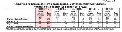 Контент-анализ публикаций СМИ с помощью системы «Медиалогия» позволил выявить следующую структуру информационного пространства, в котором действуют думские политические партии (таблица 1).