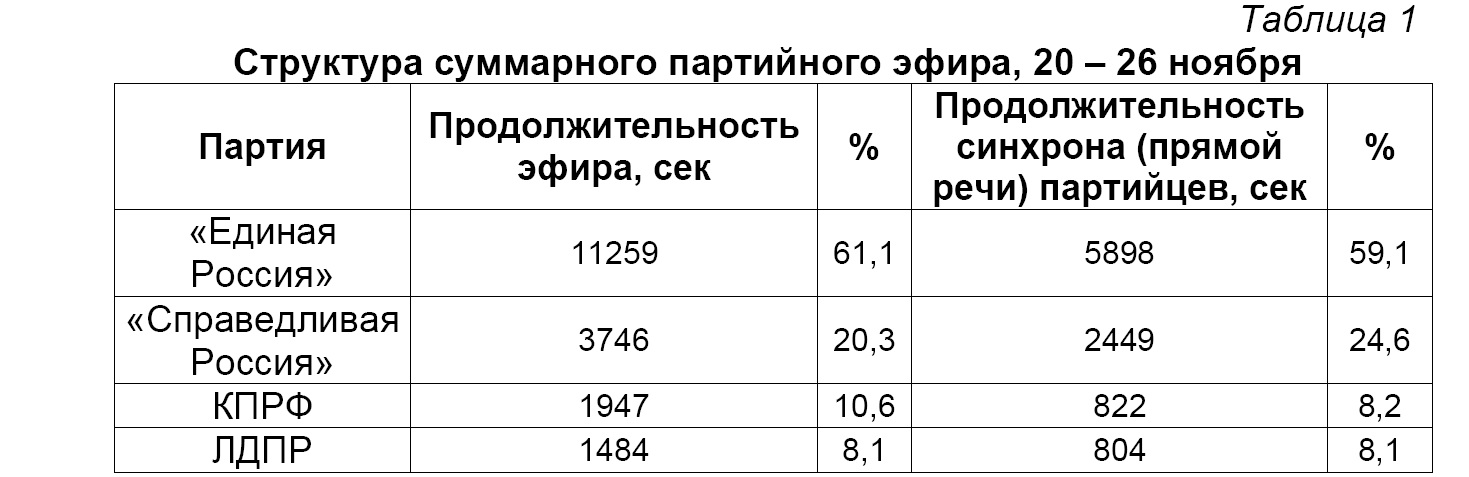 За период с 20 по 26 ноября на пяти федеральных телеканалах четырём парламентским партиям было посвящено 5 часов 7 минут 16 секунд новостного партийного эфира (Таблица 1).