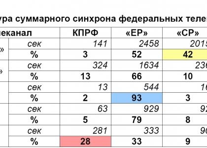 Максимальную долю суммарного синхрона предоставил коммунистам Рен-ТВ (28%). Наименьшую долю суммарного синхрона предоставили КПРФ «Первый» канал и НТВ (3 и 2%).