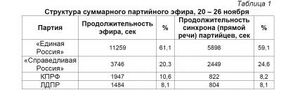 За период с 20 по 26 ноября на пяти федеральных телеканалах четырём парламентским партиям было посвящено 5 часов 7 минут 16 секунд новостного партийного эфира (Таблица 1).