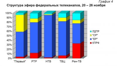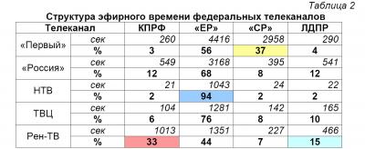 «Единой России» была предоставлена наибольшая доля телеэфира на НТВ (94%). Ниже всего данная величина опустилась на Рен-ТВ (44%). «Справедливая Россия» заняла максимум эфира «Первого» телеканала (37%). ЛДПР отдали предпочтение Рен-ТВ и «Россия» (15 и 12%).