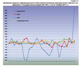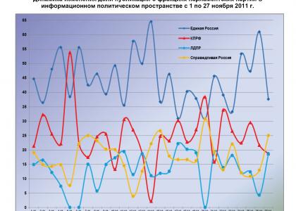 Динамический ряд, отражающий порядок наполнения медиа-потока публикациями о деятельности парламентских партий за период с 1 по 27 ноября 2011 г. (график 1), позволяет заключить, что 26 ноября показатель единороссов был близок к минимальному, а представителей парламентской оппозиции – к средним за анализируемый период значениям. 27 ноября степень присутствия в информационном пространстве «Единой России» достигла ноябрьского максимума, а КПРФ, ЛДПР и «СР» - минимума.
