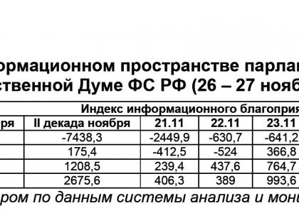 Распределение медиа-поля между фракциями в Государственной Думе рассматриваемых политических сил 26 – 27 ноября таково: 14 (61%) и шесть (37,6%) сюжетов соответственно у «Единой России», пять (21,7%) и три (18,7%) – у КПРФ, три (13%) и четыре (25%) – у «Справедливой России», один (4,3%) и три (18,7%) – у ЛДПР.