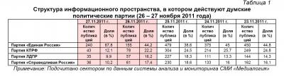 Контент-анализ публикаций СМИ с помощью системы «Медиалогия» позволил выявить следующую структуру информационного пространства, в котором действуют думские политические партии (таблица 1).