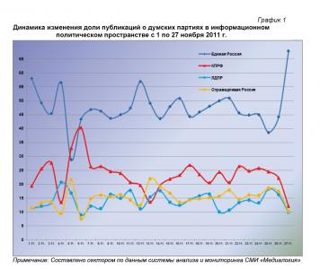 Динамический ряд, отражающий порядок наполнения медиа-потока публикациями о деятельности парламентских партий за период с 1 по 27 ноября 2011 г. (график 1), позволяет заключить, что 26 ноября показатель единороссов был близок к минимальному, а представителей парламентской оппозиции – к средним за анализируемый период значениям. 27 ноября степень присутствия в информационном пространстве «Единой России» достигла ноябрьского максимума, а КПРФ, ЛДПР и «СР» - минимума.