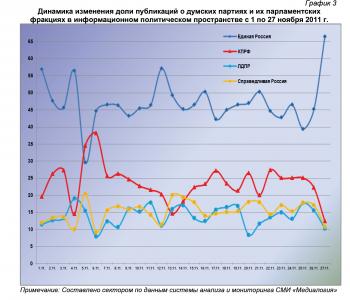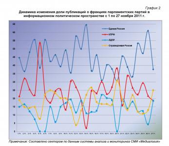 Анализ динамики доли публикаций о фракциях парламентских партий за 1 по 27 ноября 2011 года (график 2) позволяет заключить, что на 26 ноября пришёлся стремящийся к максимальному процент упоминания в СМИ думских единороссов, а к минимальному – представителей парламентской оппозиции. 27 ноября фиксировался близкий к максимальному процентный показатель ЛДПР и «СР», а к минимальному – «ЕР» и КПРФ.