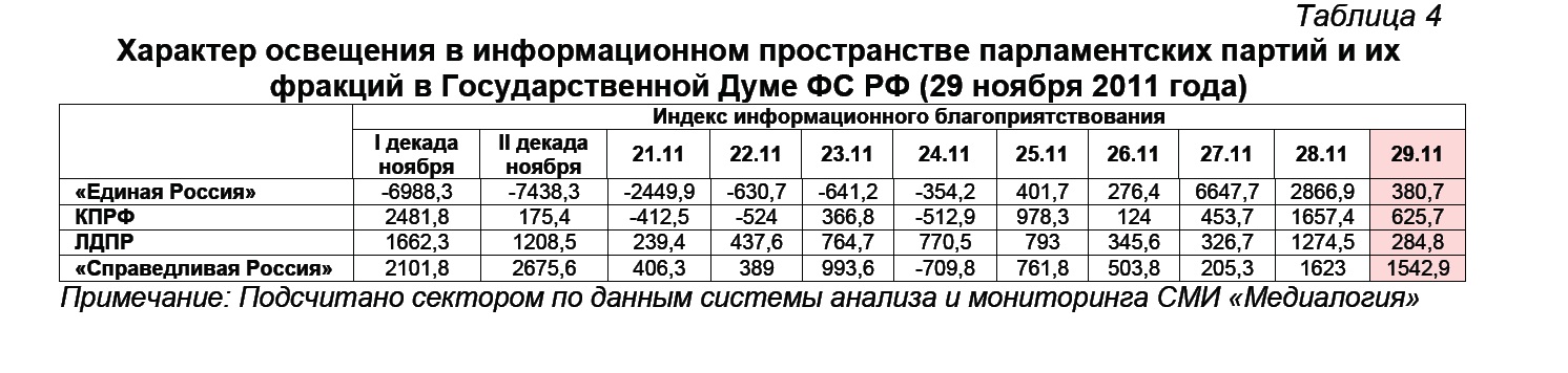 Характер освещения в информационном пространстве парламентских партий и их фракций в Государственной Думе ФС РФ (29 ноября 2011 года)