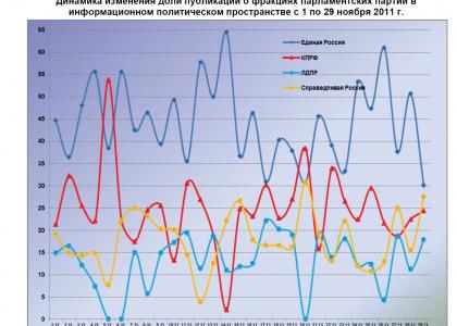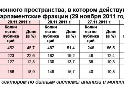 29 ноября 2011 г. в информационном пространстве отмечалось 415 упоминаний партии «Единая Россия» или 48% от общего числа высказываний, озвученных в адрес парламентских партий. В 193 материалах (22,3%) фигурировала КПРФ, в 152 (17,6%) – «Справедливая Россия», а в 105 (12,1%) – ЛДПР.