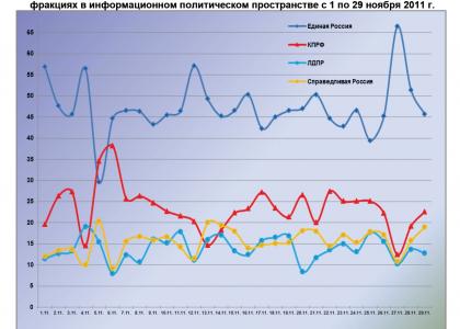 Анализ динамики доли публикаций о фракциях парламентских партий за 1 – 29 ноября 2011 года (график 2) позволяет заключить, что 29 ноября процент упоминаний в средствах массовой информации единороссов достиг минимального, эсеров и либерал-демократов – близкого к максимальному, а коммунистов – среднего (при небольшом занижении) за ноябрь значения.