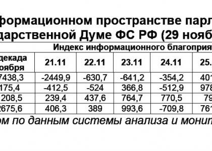 «Тематический аспект» присутствия парламентских партий в информационном пространстве 29 ноября по-прежнему, преимущественно, сводился к сообщениям о ходе избирательной кампании по выборам депутатов Государственной Думы VI созыва и размышлениям политических аналитиков о её возможных исходах. К числу самых ярких информационных поводов рассматриваемого дня можно отнести