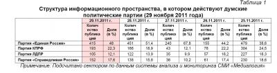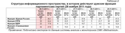 Контент-анализ публикаций СМИ с помощью системы «Медиалогия» позволил выявить следующую структуру информационного пространства, в котором действуют думские политические партии (таблица 1).