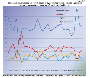 29 ноября 2011 г. в информационном пространстве отмечалось 415 упоминаний партии «Единая Россия» или 48% от общего числа высказываний, озвученных в адрес парламентских партий. В 193 материалах (22,3%) фигурировала КПРФ, в 152 (17,6%) – «Справедливая Россия», а в 105 (12,1%) – ЛДПР.