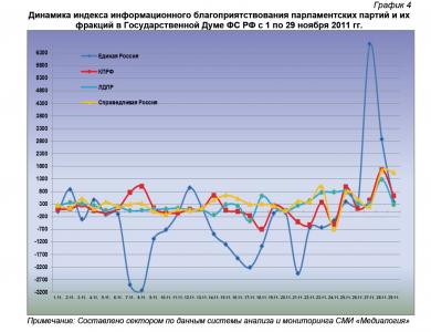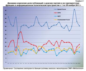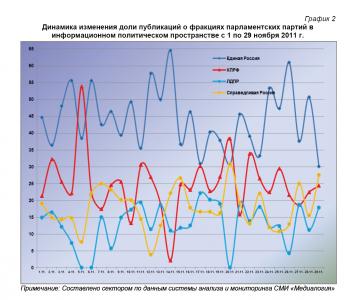 Анализ динамики доли публикаций о фракциях парламентских партий за 1 – 29 ноября 2011 года (график 2) позволяет заключить, что 29 ноября процент упоминаний в средствах массовой информации единороссов достиг минимального, эсеров и либерал-демократов – близкого к максимальному, а коммунистов – среднего (при небольшом занижении) за ноябрь значения.